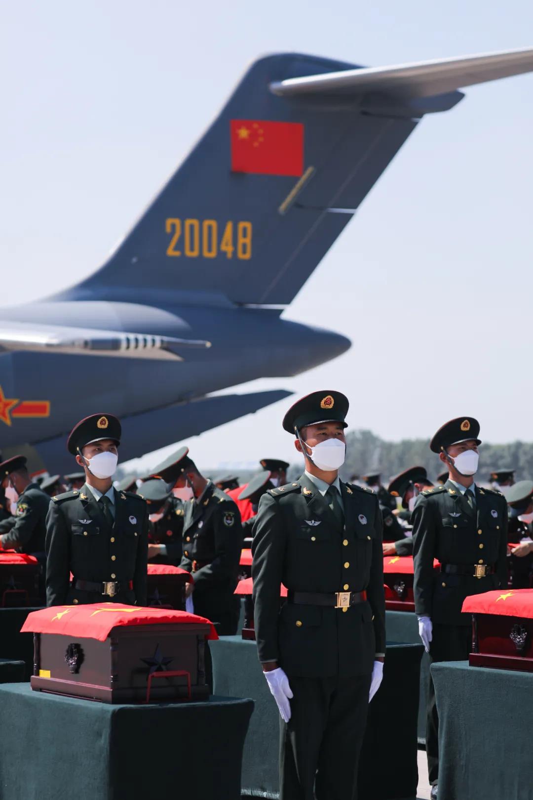 9時,中韓雙方在韓國仁川國際機場舉行志愿軍烈士遺骸交接儀式。11時26分,空軍專機平穩降落在遼寧沈陽桃仙國際機場。專機進入中國領空后,空軍兩架戰斗機護航,向志愿軍烈士致以崇高敬意,沈陽桃仙國際機場以“過水門”最高禮遇迎接志愿軍烈士回家。