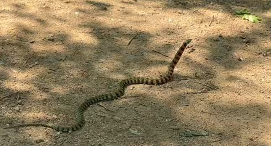 剛進入紅石砬子抗日根據(jù)地遺址,記者就被這條毒蛇“野雞脖子”尾隨。采訪過程中,還有蛇爬上了攝像機的三腳架。新華網(wǎng) 趙石樂 攝