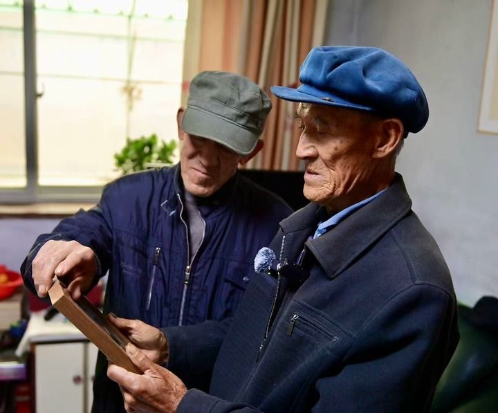11月5日,楊樹武(左)和楊忠貴烈士的弟弟楊忠利一起端詳楊忠貴烈士的照片。新華社記者 吳青昊 攝